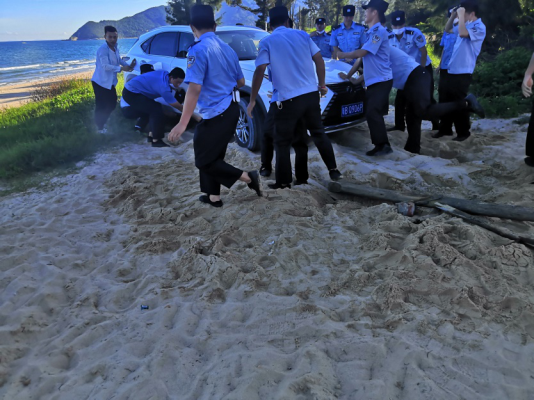 6月19日下午,当学警们正在沙滩上巡逻的时候 ,也遇到了同样的事情,下图是学警们合力帮助游客推深陷在泥沙里的车。这次好像比上次困难了许多,尽管手边没有可以挖沙的工具,但他们还是想办法找来了树干,用树干一点点的将泥沙刨了出来。
